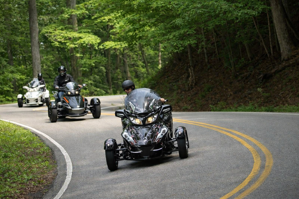 This is the first RT they gave me back in 2009. It was fully customized even though I signed contract with them that I wouldn't modify it. That just wasn't going to happen and in this pic I was riding with the VP and CEO of BRP and they didn't say anything other than they had a blast riding with on the Tail of the Dragon. I can tell you these guys were not "Suits" they were riders! I started off kinda slow just to show them I was being nice with the bike they gave me but they were right on my butt. I decided to crank it up a notch or two and see how they did. By the time I was running full out I realized I couldn't shake these guys. I've ridden that road over a hundred times and they just flew in from Valcourt Canado on the private jet 2 hours before and had never been on that road. That's when I knew these guys and BRP in general are the real deal. They push all their products to the limit! Hats off to them.